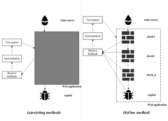 Our method uses the vulnerable code relevant information (potential RCE vulnerability information) provided by static analysis as a lighthouse. The vulnerable code-relevant information includes the file path that may have vulnerabilities and potentially dangerous code lines, etc. Then, we perform checkpoint [] instrumentation on the target web application source code and insert output statements in the checkpoint context which can greatly increase the amount of feedback information during fuzzing. The checkpoint here means the branch node from the program entry to the target code line. The comparison between our method and the existing method is shown in Figure 2. The existing methods (a) can only determine whether the vulnerability is successfully triggered based on the response information of the web application. The internal state of the target program is in an unknown state, which is essentially a black box test. Our method (b) can learn the passing of each checkpoint. According to the checkpoint passing situation, the test seeds with better performance are selected for the next round of mutation. In addition, we use a preset vulnerability payload (such as printing special keywords, etc.) which makes it possible to know whether the vulnerability is successfully triggered through the response information of the web application.