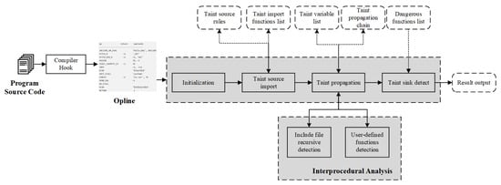 Static taint analysis first converts the source code to IR opcodes through the compiler hook; the auxiliary data structure cooperates with the taint analysis component to perform taint analysis on the opcodes; and the interprocedural analysis component is used in the taint propagation analysis process; finally, the information about the vulnerable code is output. This information includes the path of the file where the vulnerable code is located, the program control flow graph of the file where the vulnerable code is located, and the taint propagation chain (including taint source point, taint propagation, and taint sink points).