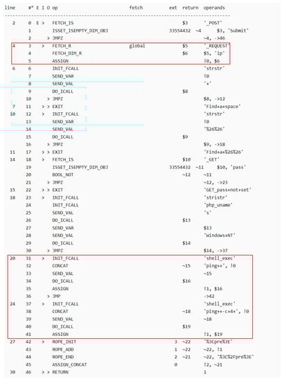 Opcodes converted from sample code 1 is shown in Figure 5, where the taint source point is line 4 in Figure 5 (introducing the variable IP controllable by hackers), taint propagation refers to the propagation process of the tainted variable in Figure 5 $5-> $6->! 0->shell_exec, and taint sink points are line 20 and line 24 in Figure 5 (the tainted variable is passed in and executes the dangerous function).
