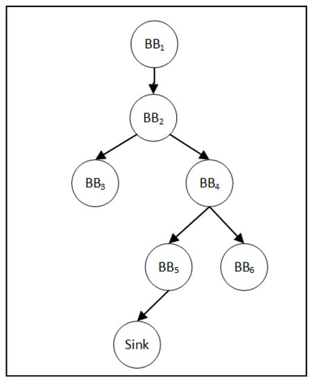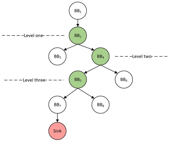 Figure 6 is a sample program control flow graph of a potentially vulnerable file, introducing the process of applying Algorithm 1 to find its checkpoint. The Sink node in the figure is obtained by the function. We used the BFS algorithm to find the set of all nodes in the CFG that can reach , that is, recursively traverse the predecessor nodes. We found all the nodes that can reach Sink node are [, , , , ], which is called the set .