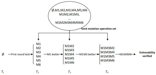 Seed mutation (c) completes the seed selection and seed mutation operation, which are key steps in fuzzing. According to the feedback information of the vulnerability verification (e), the seed selection and seed mutation are carried out according to the corresponding algorithm.