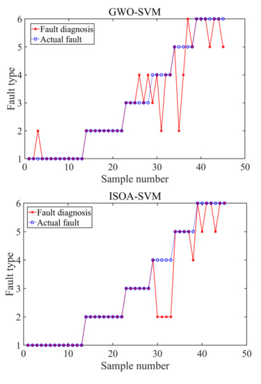 In Figure 8, the diagnosis result of GWO-SOA was the worst; the number of misjudgments was 10 and the diagnosis accuracy was 77.78%. SOA-SVM was second, with nine misjudgments, and a diagnosis accuracy of 80%. The diagnosis accuracy of the ISOA was slightly improved; there were seven misjudgments, and the diagnosis accuracy was 84.44%. The diagnosis accuracy of the ISOA-SVM model was improved compared with SOA-SVM and was much higher than the GWO-SVM model. For the ISOA-SVM model, a fault diagnosis was carried out after the KPCA processing of the data. Figure 9 shows the diagnosis results.