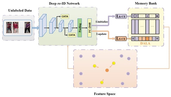 In this article, the unsupervised Re-ID problem through a softened label-based method is investigated. As illustrated in Figure 1, the framework has three components: (1) The proposed CATA module is embedded in ResNet-50 as the feature extraction network of the model. (2) Without label information, each unlabeled image data is treated as an individual class. The classification network is adopted to initialize the image feature representations, then storing them in the memory bank as shown in the purple part in the Figure 1. (3) The DALA method is proposed to re-assign softened labels to images, then the model will be retrained with new label information. Those features after training will update the memory bank, which is shown in the orange part in Figure 1.