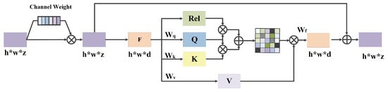 Given an input tensor of shape (h, w, c), where h, w, and c respectively refer to the height, width, and the number of channels of the feature map Z. Firstly, 1 × 1 convolution is used to reduce the channel dimension of the feature map Z to a smaller dimension d, creating the new feature map . Then, the input of the Transformer Encoder requires a one-dimensional sequence into a one-dimensional sequence. So the two-dimensional feature map is flattened to a matrix . Lastly, the multi-head self-attention (MHSA) as proposed in the Transformer architecture is performed. The output of the self-attention mechanism for a single head can be formulated as: