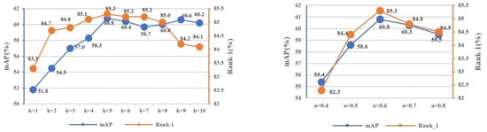 Hyper-parameter Analysis. Some important hyper-parameters are investigated in this section. Figure 3 shows the effects of parameter k and parameter in Equation (4). The parameter k denotes the number of selected reliable features. It can be observed that as k increases from 1 to 5, rank-1 accuracy and mAP on Market1501 continue increasing. When k is 0, meaning the model does not learn from other samples, the rank-1 accuracy achieves only 28.7% (data not shown). It can be seen that, as k increases, rank-1 increases by 2%, while mAP increases by 9%. The reason is that when k is relatively small, the learned similarity is not adequate, and the model has difficulty finding enough images of the same identity. When k is 5, the model finds enough images of the same pedestrian, and it performs best at this time. However, as k continues to increase, the performance of the model decreases, which means that the model erroneously involves other pedestrian images. However, thanks to our DALA method, the wrong pedestrian image will get a smaller softened label, reducing its negative impact. Therefore, even if the number of k continues to increase, the model can maintain a good performance, which shows that the model is sufficiently robust. As for scaling coefficient , it controls the confidence of similar features. Through Equation (4), when the value of is relatively small, the confidence of similar image features will be small, which causes the model to pay more attention to the sample feature and ignore the importance of similar features. On the contrary, when the value of is large, it will lead to insufficient training of the sample features of the model. Therefore, it is very important to maintain an appropriate relationship between the sample feature and similar features.
