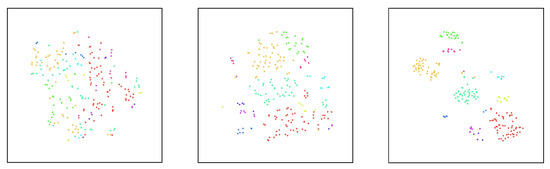 As shown in Figure 4, the T-SNE [] method is used to visualize each stage of the proposed method. Firstly, a pre-trained model is used on ImageNet to visualize the distribution of pedestrian data, and since the pre-trained model already has basic recognition capabilities, it can be seen that a little part of the same pedestrian features is close in the feature space. However, the pre-trained model is a generalized model and does not target pedestrian tasks very well, so that the pedestrian data is still very scattered in the feature space. Then, after the model is initialized, the same pedestrian data already has a similar distribution in the feature space. Because the model first treats each pedestrian image as a separate category, pulling the rest of the categories farther away during initialization, the data presents a very fragmented state. Finally, the model is fine-tuned by softened labels, and in the process of fine-tuning the model, similar features gradually converge. From Figure 4, the fine-tuned model successfully pulls pedestrians of the same category closer than the initialized model, and the model thus learns a better distribution.