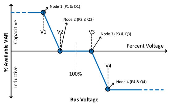 As shown, the cooperation of the type-3 DERs is determined based on their associated Volt-VAR curve, which is schematically depicted in Figure 2 and formulated in Equation (2):