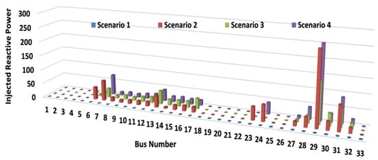 Using an illustrated algorithm, the injected reactive power of the pre-mentioned four scenarios is obtained. The reactive power injection of type two and type three DERs in all scenarios are depicted in Figure 8.