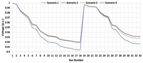 A comparison between the buses’ voltages in the aforementioned scenarios is depicted in Figure 9.