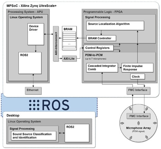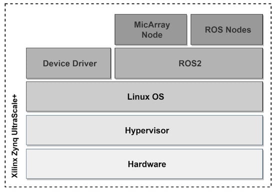 Figure 7 depicts the software stack that is supported by the PS. The ROS2 system, supported by a virtualized Linux, is used to ease the integration of the microphone array with the ROS network standard. As previously shown in Figure 2 from Section 2, it provides specific interfaces of nodes and topics, allowing both for system flexibility, scalability, and interoperability features. Moreover, to configure and capture the audio data packages from the microphone array within the OS, a device driver was developed and included in the custom Linux image. Finally, to guarantee data security and prevent unwanted accesses from third parties to the audio data that flows through the system, an additional virtualization layer was added through our in-house made static partitioning hypervisor Bao [56].