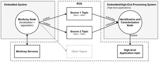 Figure 2 depicts the ROS architecture of the microphone array for sound identification and localization. Upon the arrival of new audio data, the MicArray Node reads and processes the output from the localization algorithm in the PL, that is, the DoA and the source audio sample in the WAV format, and publishes it to multiple topics according to the audio source (one topic for each source). Finally, each audio source topic is subscribed to by the Identification and Characterization Node, which applies the classification and identification algorithms and forwards data to higher-level applications for further processing. Moreover, the system provides a collection of services, which act as an interface to execute several actions, for example, performing hardware initialization, change parameters, configure the microphone array, and so forth.