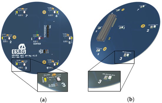 To develop the sensor system, and to comply with the project’s requirements, the microphone array must provide specific features such as: (1) have an UCA geometry with a maximum diameter of 10 cm; (2) use up to seven low-power MEMS microphones; and (3) include an FMC interface. In contrast to linear arrays, a UCA geometry allows the use of sound source localization in a 3D space, and the FMC interface allows the Printed Circuit Board (PCB) to be plugged into other platforms that support this connector. All microphones are spaced five centimeters apart, providing a UCA with six microphones placed around the circumference (60° between microphones). Additionally, one microphone is placed in the center to be used as reference during the computation of the algorithms. The PCB layout also has six LEDs, placed around the array and parallel to the microphones, to indicate the calculated localization of the detected sound source. The FMC connector, placed at the bottom side, allows us to make the direct connection between the processing platform and the microphones and LEDs.