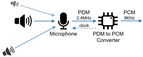 - Knowles. Digital SiSonic Microphone With Multiple Performance Modes. In Datasheet SPK0641HT4H-1 Rev A; Knowles Electronics, LLC: Itasca, IL, USA, 2016. [Google Scholar]
