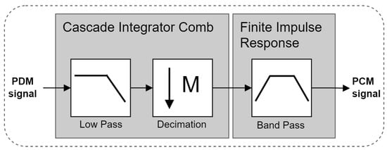 To convert the signal from PDM to PCM for each microphone [54], the processing steps depicted in Figure 5 were used. The process has three stages, starting with a low-pass filter that receives the PDM signal from the microphone and, after a quantization process, outputs a new signal to the next block. Since the microphones use a sampling frequency of 2.4 MHz, the next block performs a decimation by a factor of 300, which creates a new signal frequency of 8 kHz. These two stages are developed in the FPGA using a Cascade Integrator Comb (CIC) filter block. The last stage corresponds to a Finite Impulse Response (FIR) filter block, that performs a band-pass filter. This filter has the lower cut-off frequency at 70 Hz to remove the Direct Current (DC) component, and it has the upper cut-off frequency at 3 kHz, which reduces possible aliasing phenomena (audio and spatial aliasing). Although the bandwidth of the pass-band filter is between 70 Hz and 3 kHz, this range is enough for the human voice’s fundamental frequency, which is commonly between 85 and 155 Hz for an adult male, and 165 to 255 Hz to an adult female [55].