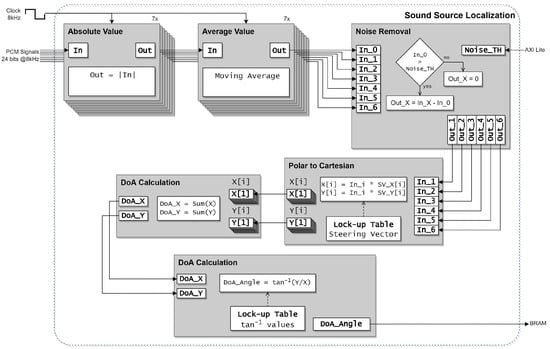 The algorithm to localize the sound sources is presented in Figure 6. Since its working principle is based on the signals energy, it requires data from all microphones to calculate the DoA of the sound source. This task is performed in six sequential steps: (1) Absolute Value; (2) Average Value; (3) Noise Removal; (4) Polar to Cartesian; (5) DoA Calculation; and (6) Get Angle.