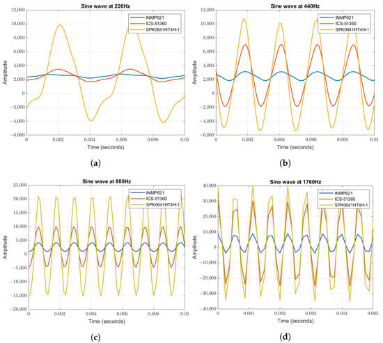Data acquisition by the three types of microphones at different frequencies. (a) Sine wave at 220 Hz. (b) Sine wave at 440 Hz. (c) Sine wave at 880 Hz. (d) Sine wave at 1760 Hz.