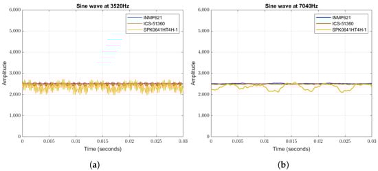 Sine wave acquisition for frequencies above the filter’s passband. (a) Sine wave at 3520 Hz. (b) Sine wave at 7040 Hz.