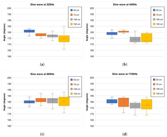 Box plot of the DoA measurements at different frequencies and distances. (a) Sine wave at 220 Hz. (b) Sine wave at 440 Hz. (c) Sine wave at 880 Hz. (d) Sine wave at 1760 Hz.