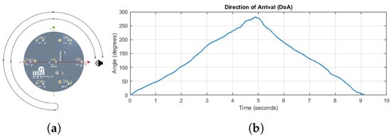 Moving sound pattern and respective calculated DoA. (a) Sound source path. (b) Direction of arrival of a sound source over the time.