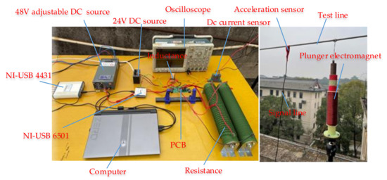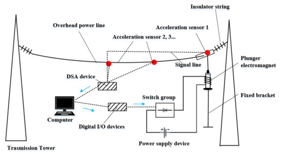 - Taking a reduced-scale test line with a 35.4 m span as an example, the plunger electromagnet and the corresponding power supply loop were designed to provide the impulse excitation force for the wire system. Acceleration sensors, DSA device, digital I/O device and computer were used to monitor wire vibration and control the coil current.