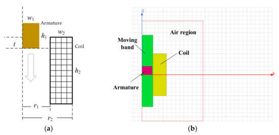 The 2D axisymmetric model of the plunger electromagnet. (a) Schematic diagram of the 2D axisymmetric model; (b) model in Maxwell software.