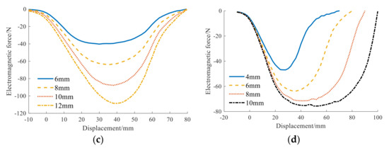 Simulation results of electromagnetic force. (a) Influence of coil radial thickness on the electromagnetic force; (b) influence of coil axial thickness on the electromagnetic force; (c) influence of armature radial thickness on the electromagnetic force; (d) influence of armature axial thickness on the electromagnetic force.