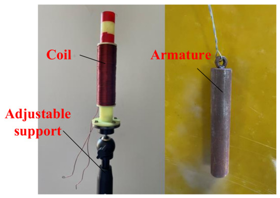The photo of the plunger electromagnet, including the coil made by enamel-coated copper wire, armature made by electrical pure iron and the adjustable support, is shown in Figure 4. The measured coil resistance is 1.674 Ω, and the coil self-induction is 2.15 mH.