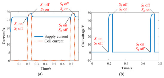 The loop model of the designed power supply was established in MATLAB according to the actual parameters. The simulation includes two cycles and four switching processes. The coil current and power current change with time as shown in Figure 6a, and coil voltage changes with time as shown in Figure 6b.