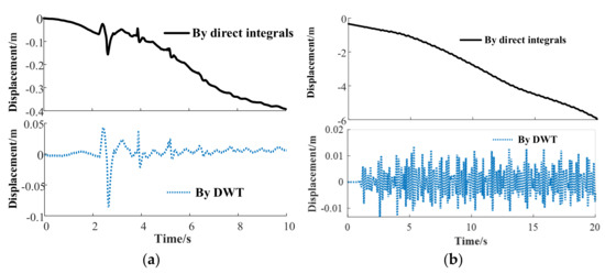 Since the displacement signal is a discrete time series, a fast discrete wavelet transform (DWT) is adopted. In brief, the mean value of the collected acceleration data is subtracted and then two-time integrals are calculated at first. Then, through decomposing and reconstructing the displacement time series by using the above DWT method, the real displacement data of wire vibration can be obtained. Taking the acceleration data of the excitation point under single excitation and continuous excitation with second-order natural frequency interval as examples, the displacement–time curve obtained by direct integration is compared with that obtained by the DWT method, as shown in Figure 10.