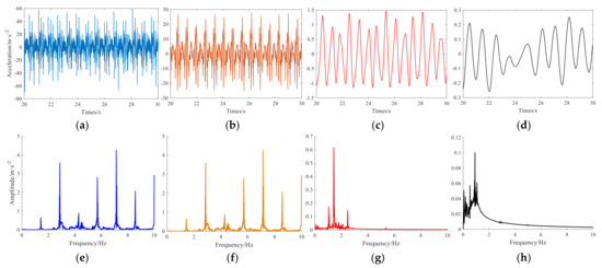 Feature extraction of the measured acceleration signal. (a) Original signal. Reconstruction results of (b) layer 5, (c) layer 9 and (d) layer 10. (e) Spectrum of the original signal. Spectrum of (f) layer 5, (g) layer 9 and (h) layer 10.