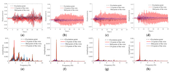 The acceleration sensors were installed at the typical points of the wire during the test. The excitation point was about 1 m away from the wire hanging point. In order to prove the superiority of the adaptive excitation method, the wire system was excited by fixed time interval excitation and adaptive excitation. The power supply voltage was set to 20 V for both excitation methods. The fixed electromagnetic excitation interval was 0.64 s, corresponding to the second-order natural frequency of the system. As for the adaptive excitation method, the first time interval of excitation was 0.64 s, and then the judgment method based on acceleration feature extraction as described in Section 4.2 was adopted. Monitoring results of wire displacement under fixed time interval excitation and the spectrum analysis results are shown in Figure 12a,e. Monitoring results under adaptive time interval excitation and the spectrum analysis results are shown in Figure 12b,f.