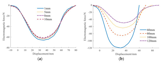 When other parameters remain unchanged, the change of the radial thickness of the coil has little influence on the electromagnetic force. The smaller the axial thickness of the coil is, the larger the electromagnetic force peak value is. However, the effective range of the electromagnetic force decreases. When the armature radial thickness increases, the electromagnetic force also increases. When the armature axial thickness increases, the electromagnetic force increases with a larger effective range. Obviously, when the armature center moves below the center line of the coil, the electromagnetic force reverses. Therefore, the maximum acting distance of the electromagnetic force is as follows: