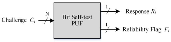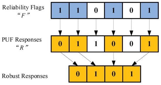 The proposed protocol is designed based on BST-PUF, which can generate the reliability flag [27], and the PUF model is shown in Figure 2. The PUF can generate a response R and a reliable flag F when the challenge C is input, and F can be used as the reliability of a response to pre-process the original PUF response. Figure 3 shows the process of extracting robust responses using the reliability flag F.