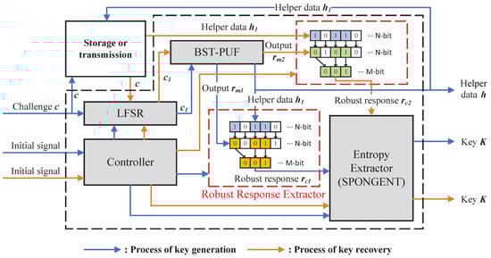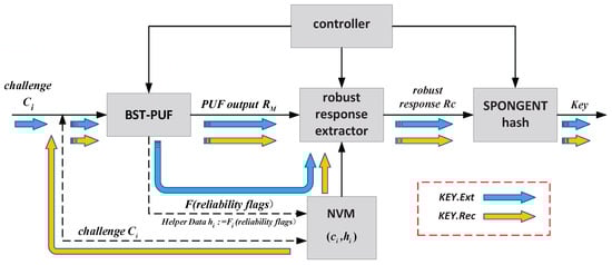 Based on the BST-APUF, we propose a lightweight HDA that can be used to extract stable cryptographic keys, or for security authentication. The proposed HDA schematic diagram process is shown in Figure 4. In the key generation process, the original challenge c will be input into the LFSR to generate a challenge collection of the BST-PUF, and the BST-PUF will generate the original output and the reliability flag F. The reliability flag F is used as the helper data in this HDA to perform the key extraction and recovery operation. Moreover, the and h1 will be input to the robust response extractor to generate the highly reliable robust response . Although, after extracting, the PUF response is reliable enough, the disclosure of the helper data in the response error correction process can lead to a large entropy loss, and the stronger the error correction capability, the relatively larger the entropy loss [36]. It even causes the PUF response to be unavailable for key generation when the entropy value is too low. Therefore, the robust response of the PUF needs to be processed by the entropy extractor to generate the high-entropy key K.