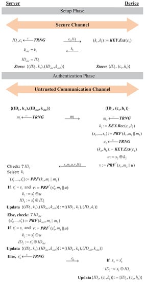The protocol execution process includes the setup phase and authentication phase. The setup phase is executed in a secure environment. The device is required to register with the server, for which it generates a random challenge and a temporary and sends it to the device. The device produces the key and helper data in the device using and sends them to the server to set the initial shared key and initial temporary ID . When the server and the device want to perform mutual authentication and message transmission, then the authentication phase begins. The specific execution process of mutual authentication is shown in Figure 5.