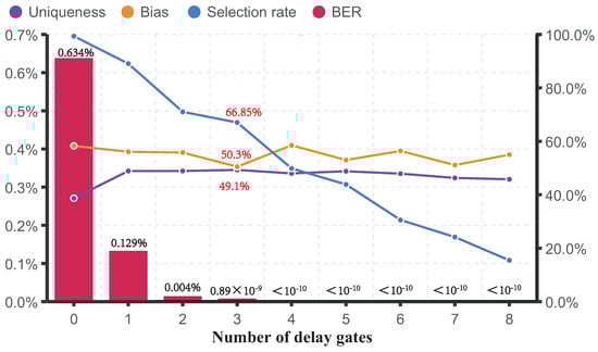 We tested three performance metrics (uniqueness, reliability, and bias) of the selected robust responses at 1.0 V and −25 C, 0 C, 25 C, and 80 C. The reliability can be expressed in terms of the bit error rate (BER), which is the percentage of false response bits acquired on average over different operating environments, and the results are shown in Figure 7. We found that when the selection rate of the selected robust response is 66.85%, the uniqueness of the PUF response is 49.1%, the bias is 50.3%, and the BER is less than . The reliability is high enough to be directly used for security authentication.