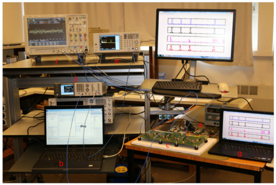 Figure 3. Photo of our compressed sampling testbed: (a) ML605 board for modulating waveforms generation, (b) PC control, (c) MWC analog front-end board, (d) Arbitrary waveform generator, (e) Spectrum analyzer, (f) DSO90404A Agilent Infiniium four-channel scope and (g) PC for spectrum reconstruction.