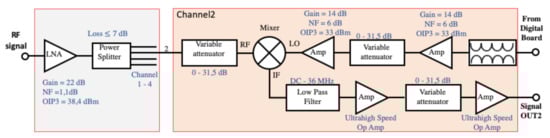 A Keysight 81180A arbitrary waveform generator is used to generate the input signal. The channel 1 is plugged to a Keysight N9320B spectrum analyzer (range frequency 9 kHz to 3 GHz) to control the simulated input signal and the channel 2 is plugged to a SCA-4-10+ splitter from Mini-Circuits® of the MWC analog front-end board with four channels. Each channel has one M1-0008 mixer from MArki® and one SXLP-36+ low-pass filter from Mini-Circuits® with a cut-off frequency F c ( 3 dB ) = 40 MHz. The SXLP-36+ filter has been chosen to match the design of the ideal low-pass filter (sharp cut-off, flat band in frequency range [DC-36] MHz). Figure 4 shows a block diagram of the analog board.