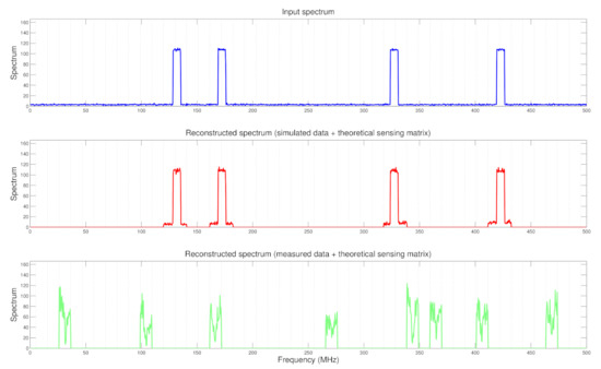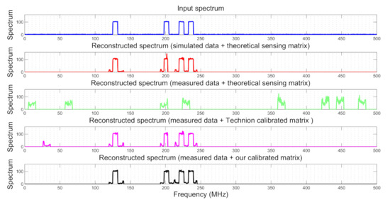 Figure 6 shows an example of spectrum reconstruction without calibration at S N R = 30 dB from the theoretical sensing matrix. Each reconstructed spectrum is in linear scale and has been normalized such that the power of each reconstructed spectrum is equal to the power of the input spectrum. Real data have been acquired and saved by the scope. Spectrum reconstruction of measured data with the theoretical sensing matrix (calculated directly from modulating waveforms) have bad detection performances and high false alarm compared to the results obtained for the simulated data. This result is due to incorrect estimation of the sensing matrix linked to analog components. Indeed, analog components introduce phases which change the theoretical sensing matrix. Consequently, the goal of the next section is to present a new calibration method to estimate sensing matrix coefficients.
