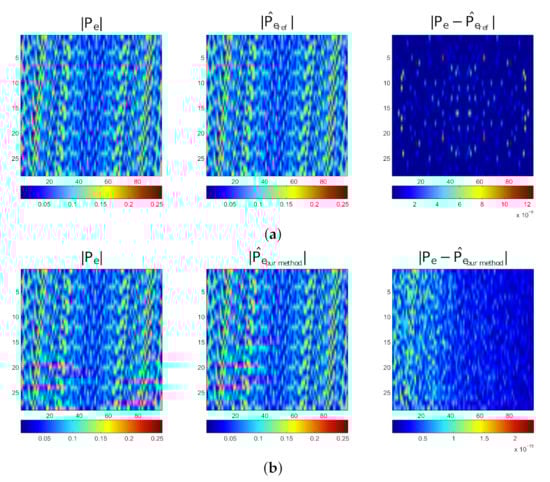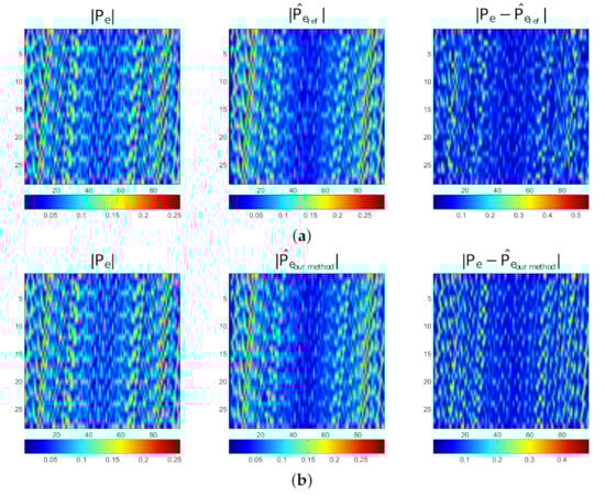 Figure 12. Comparison between theoretical matrix and calibration matrices estimated from real measurements (left: Modulus of theoretical sensing matrix; middle: Modulus of estimated sensing matrix; right: Modulus of difference). (a) Reference calibration. (b) Our proposed calibration.