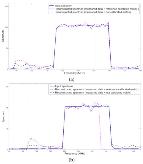 Figure 13 illustrates an example of spectrum reconstruction (4 transmitters at SNR = 30 dB) obtained with theoretical MWC scheme and data from prototype with calibration versus without calibration. It can be noted that the locations of input spectrum are correctly reconstructed with the calibration and similar to the theoretical MWC scheme whereas the results are bad in location and high false alarm without calibration. Compared to the theoretical MWC scheme, more noise is reconstructed with the calibration due to the additional noise of analog components. Note that one false alarm appears for the frequency range [26;36.5] MHz with the reference method. Figure 14a (resp. Figure 14b) is obtained by zooming Figure 13 between frequency range [119;136] MHz (resp. [190;209] MHz) and by plotting the input spectrum and spectrum reconstructed with the reference calibrated matrix and with our calibrated matrix. From Figure 14a, it is clear that the position of the transmitter has been correctly detected by both calibration methods. In the transmitter subband, amplitudes reconstructed with both calibration methods are slightly different due to the effect of noise. In the active subbands, the only noise is reconstructed depending on the calibration method. Figure 14b illustrates partial reconstruction of transmitter position obtained with the reference method whereas our calibration method can correctly detect transmitter position.
