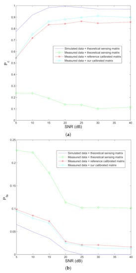 Figure 15. Correct reconstruction and false alarm rates in function of SNRs. (a) Correct reconstruction rate. (b) False alarm rate.
