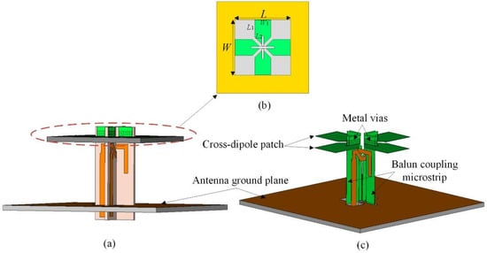 (a) Side view with dielectric substrate of matching balun and cross-dipole patches. (b) Top view of the cross-dipole patches. (c) Three-dimensional view without dielectric substrate of matching balun and cross-dipole patches.