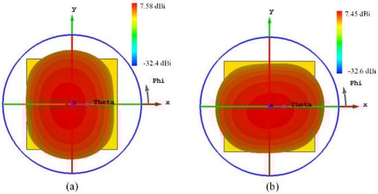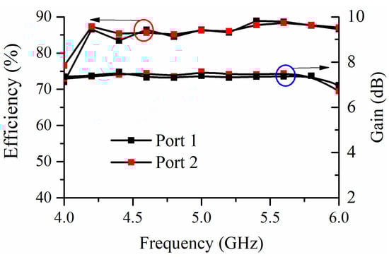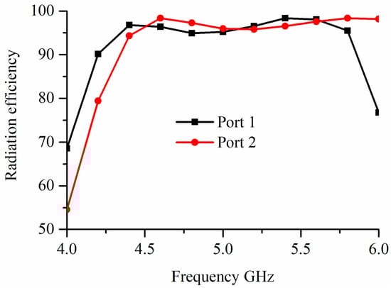 The proposed antenna was modeled and simulated using the electromagnetic simulation software CST Studio Suite (2018). The simulated 3D radiation patterns of the two polarized ports are shown in Figure 3. It can be seen that unidirectional and wide beam properties are obtained, and the patterns are orthogonal since the two ports are excited by orthogonal polarization. Figure 4 shows the simulated radiation efficiencies for the two ports. The average radiation efficiency of the ports was about 95.5%.