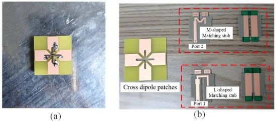 To clearly show the structure of each polarized element, the disassembled model of the proposed antenna is shown in Figure 2. For a better description, the dual-polarized antenna can be divided into two elements, namely, polarized element 1 and polarized element 2. The biggest difference between the two polarized elements is the matching balun. Figure 2a–f shows the structure of polarized element 1 and polarized element 2, respectively. For polarized element 1, the matching stub is an L-shaped stub. For polarized element 2, the matching stub is an M-shaped stub. The matching stubs are optimized simultaneously to obtain a common wide impedance bandwidth. As can be seen, the two polarized ports, port 1 and port 2 are placed orthogonally. The optimized parameters of the proposed dual-polarized dipole antenna are as follows: L = 24.3 mm, W = 24.3 mm, H = 13 mm, W1 = 7 mm, W2 = 1.6 mm, W3 = 1 mm, W4 = 1.6 mm, W5 = 1 mm, L1 = 7.5 mm, L2 = 4.36 mm, L3 = 11 mm, L4 = 7 mm, L5 = 5 mm, L6 = 13 mm, L7 = 2 mm, L8 = 1.5 mm, L9 = 2.5 mm, L10 = 1.8 mm, and L11 = 4 mm.