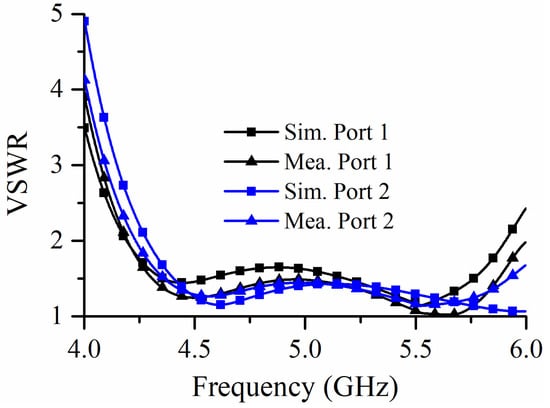 The proposed antenna was fabricated to verify the actual antenna properties. Figure 5 shows photos of the fabricated antenna. The cross-dipole patches were printed on the FR4 substrate with dielectric constant of 4.5 and a thickness of 1 mm. The matching baluns were printed on Rogers RO4003C (Rogers, CT, USA) with a dielectric constant of 3.55 and a thickness of 0.813 mm. The tops of the baluns were welded to ensure a good and reliable electrical connection. Figure 6 shows the simulated and measured VSWR (Voltage Standing Wave Ratio). As can be seen, the measured common impedance wideband with VSWR ≤ 2 covers a range of 4.28–5.92 GHz, which includes the 5.8 GHz microwave energy transmission band and the WLAN wireless data transmission band.