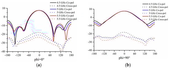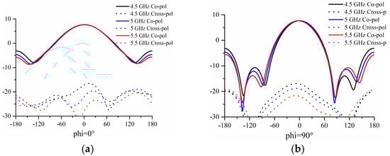 Figure 7 shows the measured radiation efficiencies and gains of the two polarized elements. The radiation efficiencies and patterns were measured in an anechoic chamber. The average measured efficiency of the two ports was about 87.3% at the operating band, and the average measured gain of the two ports was about 7.3 dBi. The radiation efficiencies and gains were flat within the working bandwidth, which shows a stable radiation performance. The decrease in antenna efficiency may be due to the loss of the RF connector and cables. Figure 8 and Figure 9 present the measured 2D radiation patterns of the proposed antenna at 4.5 GHz, 5 GHz, and 5.5 GHz. Regardless of the orthogonal placement of the two polarized elements, their radiation patterns are similar across the whole operating band. For port 1, the 3 dB bandwidth at phi = 0° (90°) was about 66° (90°). For port 2, the 3 dB bandwidth at phi = 0° (90°) was about 90° (66°). The cross-polarization level was larger than 18 dB across the whole band.
