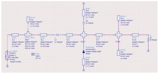 The schematic and the layout of the proposed rectifying circuit are shown in Figure 10 and Figure 11, respectively. The detailed parameters of the rectifying circuit are exhibited in Figure 10, with parameter w1 set to 1.6 mm, which is optimized for final impedance matching. As can be seen, the rectifying circuit consists of a T-shaped matching network, a pre-capacitor C1 (100 pF), a bypass capacitor C2 (100 pF), a rectifying diode HSMS-286F (Avago Technologies, San Jose, CA, USA), an output filter, and an adjustable load. The pre-capacitor C1 can block the reversed DC current, and the bypass capacitor C2 is able to suppress the high-order harmonics. An output filter is also used for suppressing the high-order harmonics. To facilitate debugging, we used a tunable resistance to act as the load Rload. The proposed rectifying circuit was printed on the bottom surface of the antenna ground plane. Each rectifying circuit was connected to a polarized antenna element.