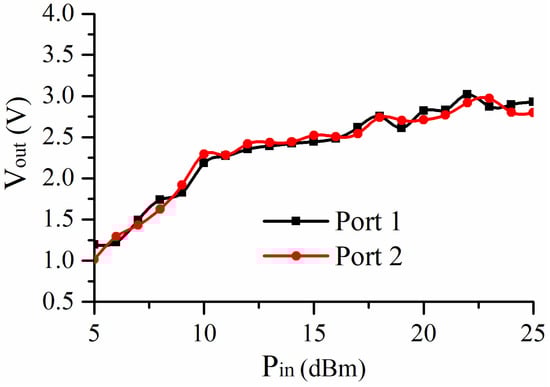 The output voltage of the rectifying circuit vs. the input power at 5.8 GHz is given in Figure 12, with the load Rload adjusted to 350 Ω. As the input power increases, the output voltage also increases. The fabricated antenna and rectifying circuit are shown in Figure 13a,b, and the wireless power transmission experiment was performed in an open environment surrounded by several absorbing materials, as shown in Figure 13c. To reduce the effect of the ground reflection, the absorbing materials were spread on the ground. During the experiment, a 10 dBi standard gain horn antenna was used for transmitting power. The horn and the antenna were set at the same height, and a voltmeter was used to detect the output DC voltage. The distance between the horn and the rectenna was 1 m, and the test frequency was 5.8 GHz. The load resistance RLoad was adjusted from 300 Ω to 400 Ω.
