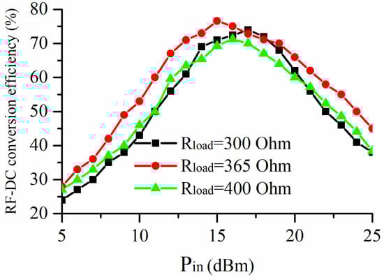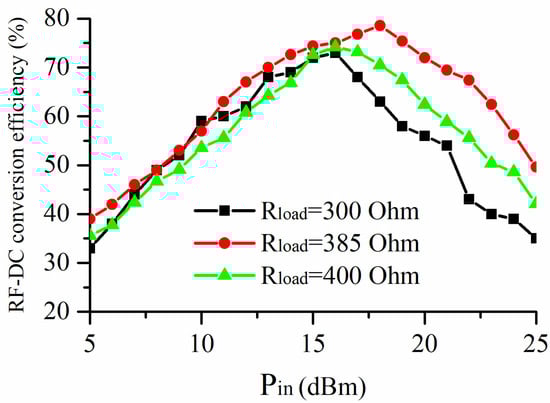 Measured RF–DC conversion efficiency under different loads Rload and input power values Pin, at port 2.